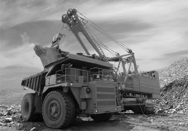 Blasted rock which size of pieces is up to 1000 mm in diameter are stowed by excavator on vehicles and sent to the factory.